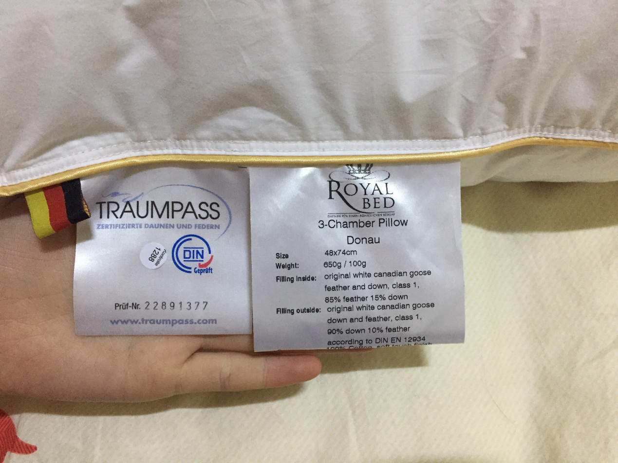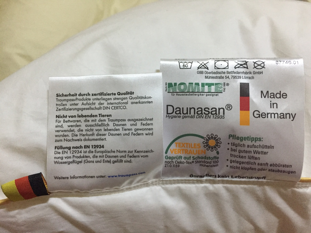 各类角标都很齐全。说实话,我刚开始也是懵逼的,德语无能,就能看出是德国制造,查了一下编码,确实是正品。其它什么,Traumpass、DIN EN12934、Daunasan ………都是欧洲羽绒羽毛清洁卫生认证等六项国际权威机构认证证书。具体我也不太清楚,但感觉挺靠谱的。