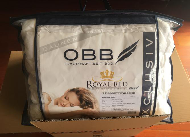 原装包装袋很有德国简约风格,上下及侧面均为深蓝色无纺布材质,还算大方。包装正面透明,可以直接看到雪白白的被面,内部夹层置一张彩页,上面印有公司LOGO、品牌LOGO和一些具体的产品信息。